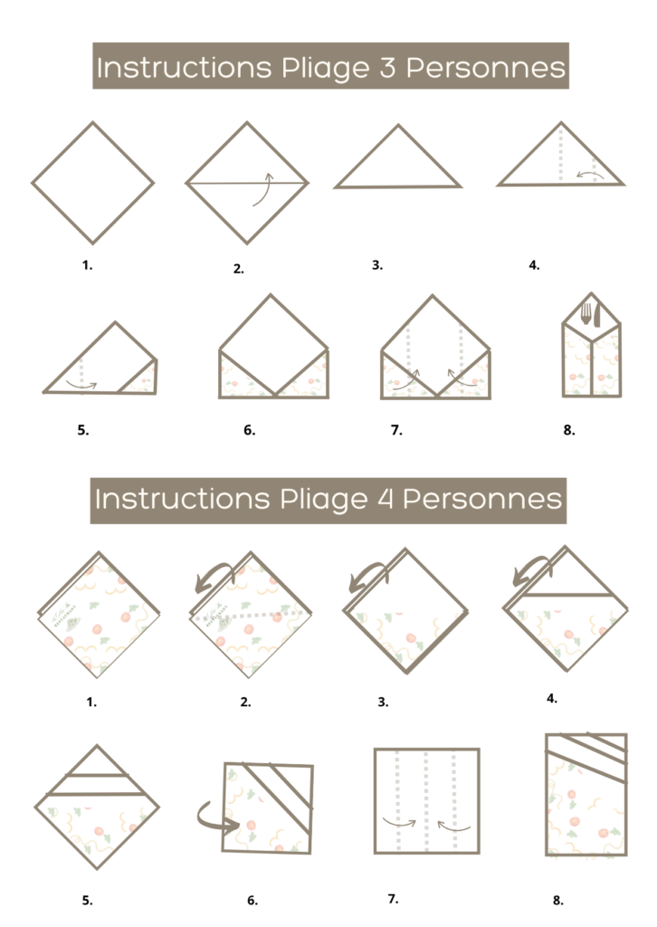 Regardez le plateau de jeu. Il y a trois serviettes présentes sur sa table. Pliez les serviettes en suivant le schéma « instructions pliage 3 personnes.
