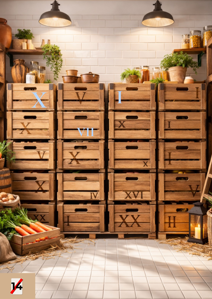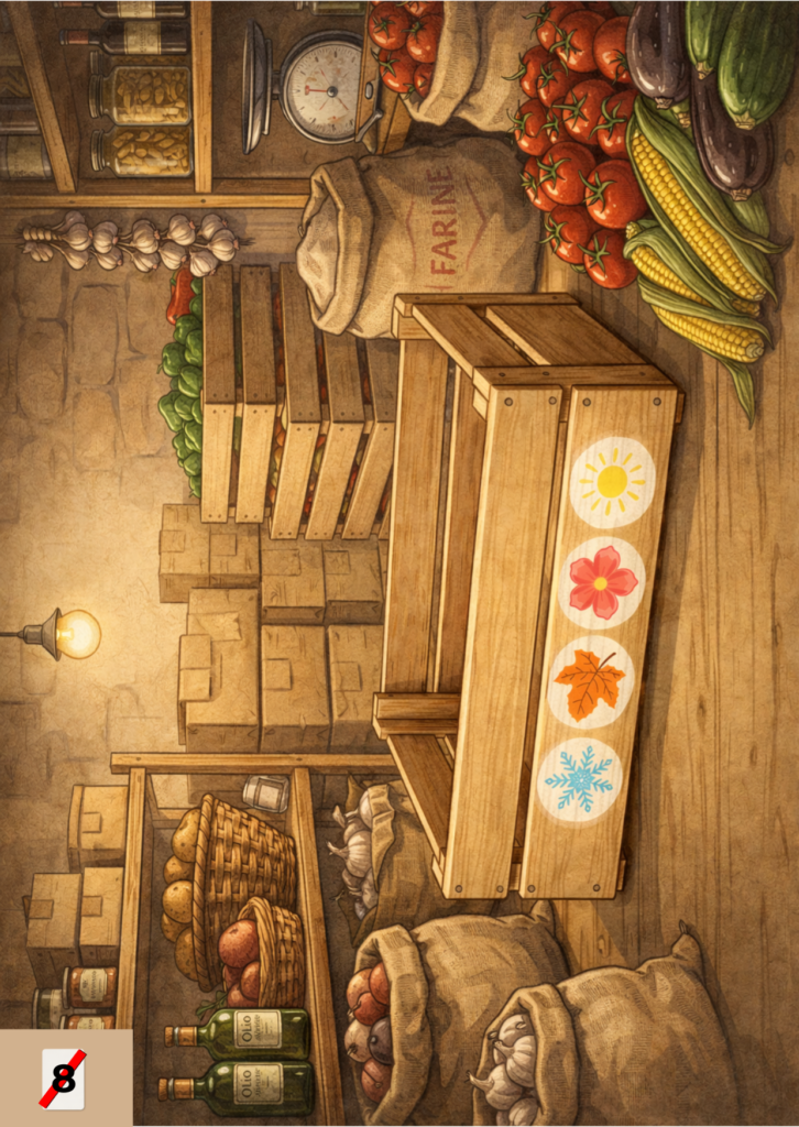 Regardez le mur de la réserve dans la boite de jeu. Les cagettes visibles sur le mur correspondent aux cagettes sur votre carte. Regardez bien les couleurs de celle-ci.